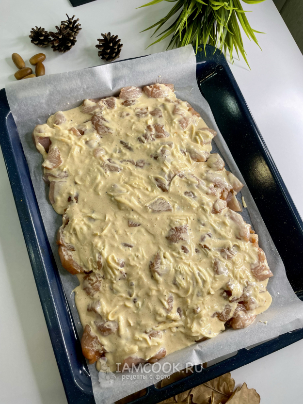 Противень застилаем пергаментной бумагой и смазываем растительным маслом. Кладем нарезанное филе. Сверху заливаем заправкой.