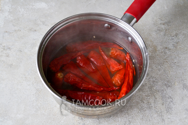 Налейте воду в сотейник, доведите ее до кипения и опустите острые перчики вместе с семенами. После закипания проварите перцы ровно 5 минут. Снимите сотейник с огня и охладите перцы в отваре до теплого состояния. Можно вынести на балкон, чтобы остыли быстрее.
