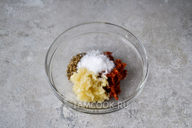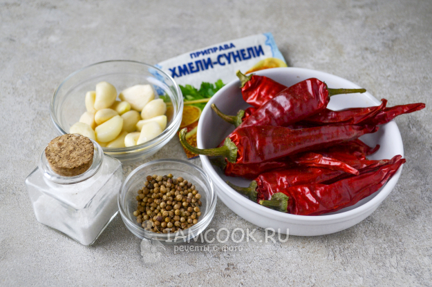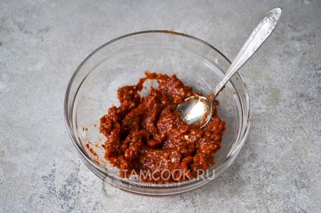 В мисочку положите прокрученный острый перец, чесночную кашицу, измельченный кориандр, хмели-сунели и соль.