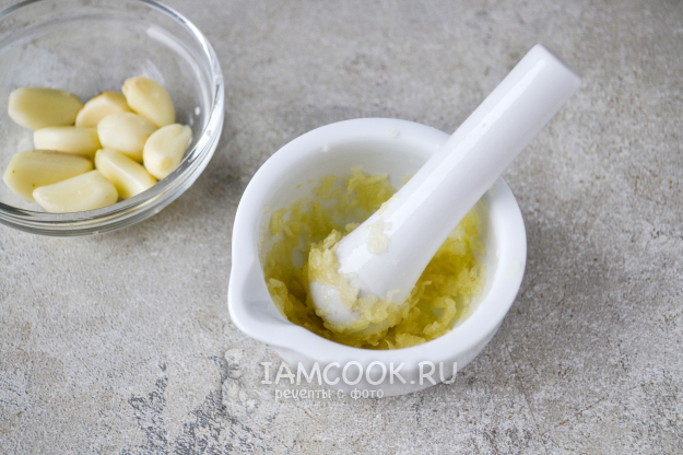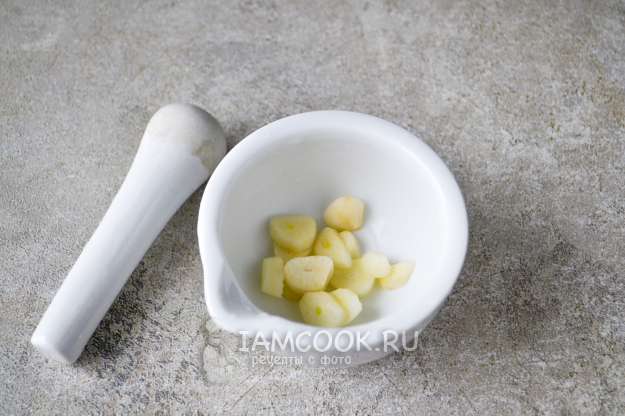 Добавьте в ступку щепотку соли и пестиком разотрите до состояния кашицы.