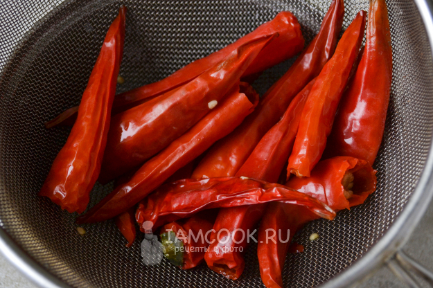 Соберите необходимые продукты для приготовления Мегрельской аджики. Чеснок почистите. У сухого перца чили отделите плодоножку.