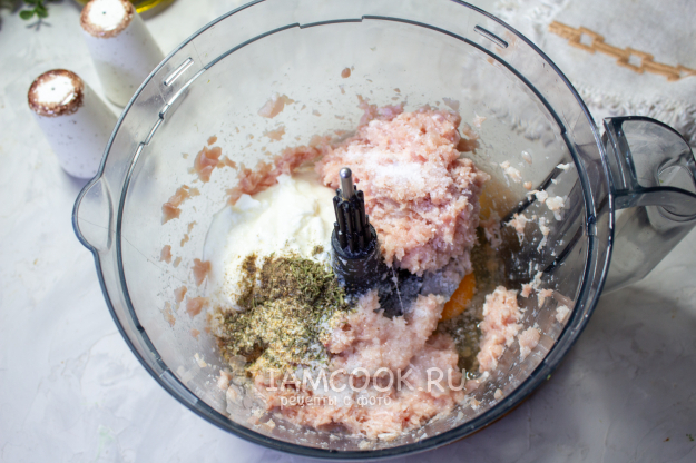 Измельчите курицу в фарш, добавьте яйцо, специи и йогурт.