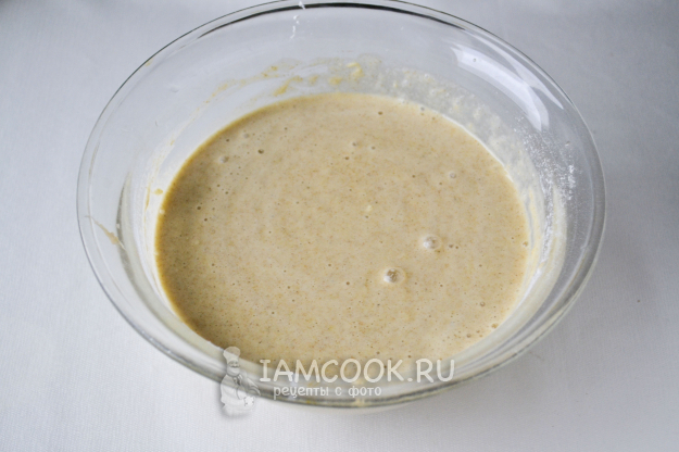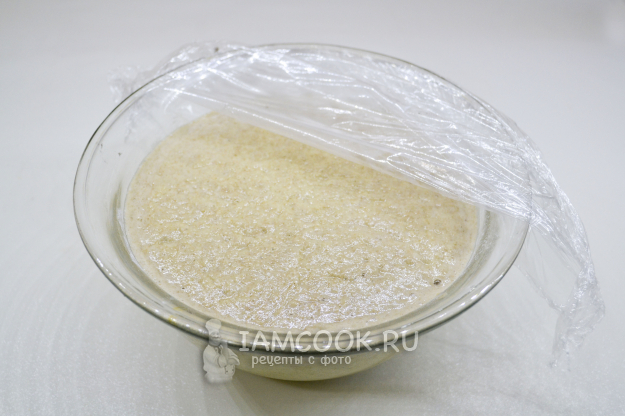 Воды нужно столько, чтобы получилось негустое тесто. Перемешайте. Затяните миску пищевой пленкой и поставьте в теплое место для подъема.