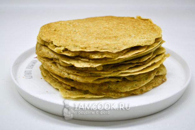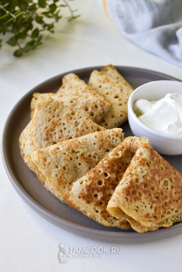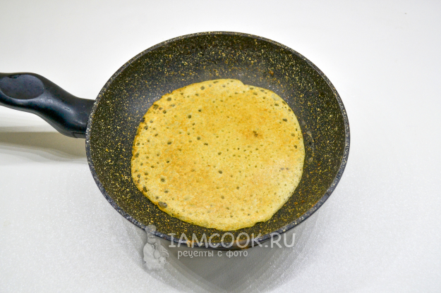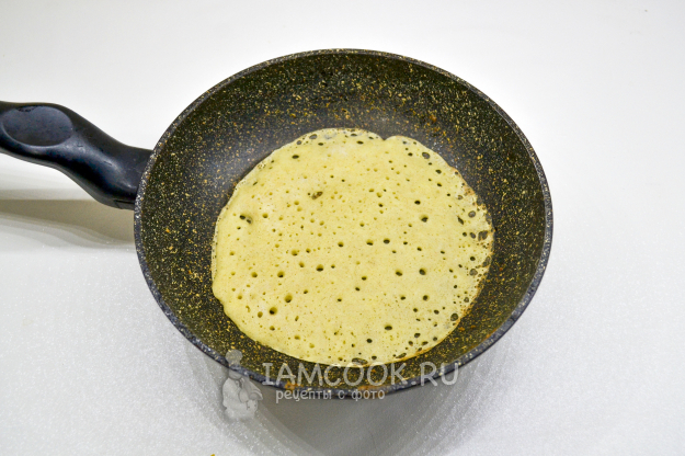 Слой теста получился не очень тонким, примерно 2-3 мм. Когда поверхность станет матовой, в дырочках, края чуть подсохнут и начнут отходить от сковороды, аккуратно переверните блинчик.