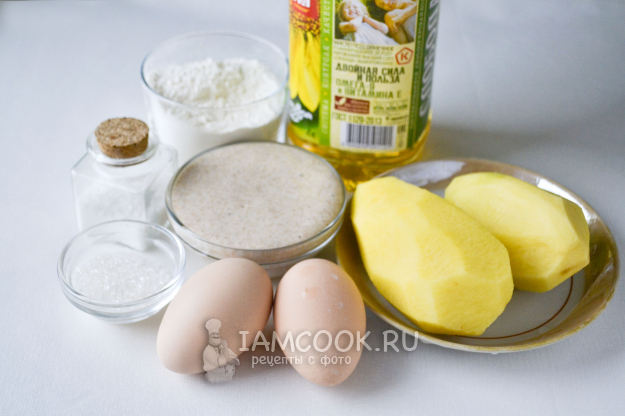 Соберите продукты для приготовления кислых блинов на закваске с картошкой. Картофель вымойте и почистите. Закваску возьмите на пике ее подъема. Рецепт закваски можно посмотреть здесь.