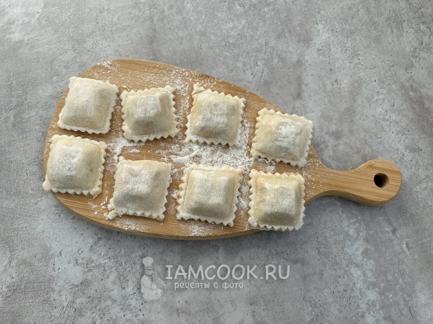 На одну половину раскатанного теста выложите небольшие порции начинки на расстоянии примерно 3 см друг от друга. Накройте второй половиной теста и аккуратно прижмите вокруг каждой порции начинки, чтобы выпустить воздух. Вырежьте равиоли квадратной формы с помощью фигурного ножа.