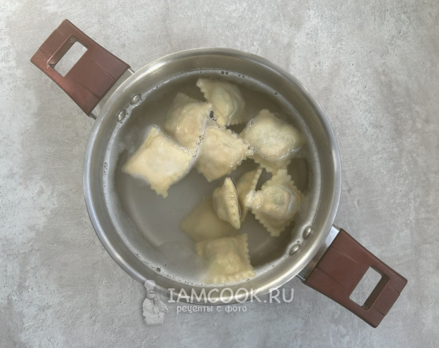 В кастрюле доведите до кипения подсоленную воду, небольшими порциями опустите заготовки и варите после всплытия 3-4 минуты. Аккуратно достаньте шумовкой готовые равиоли.