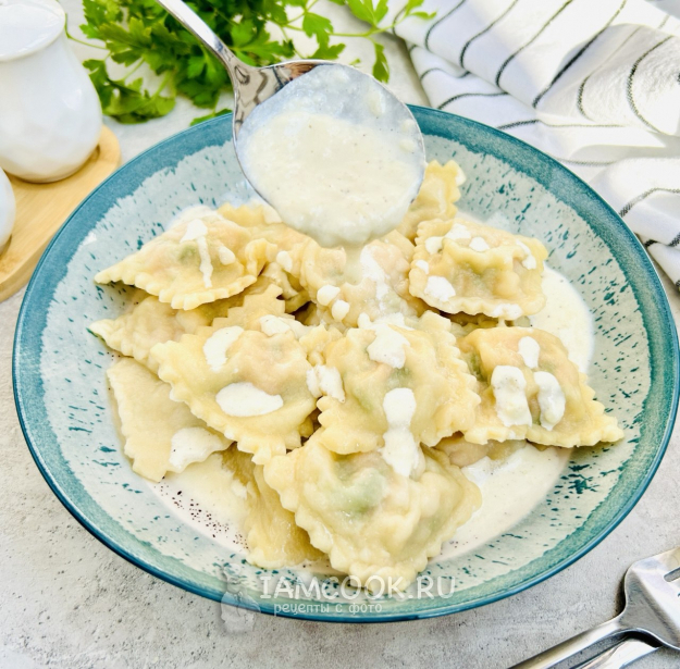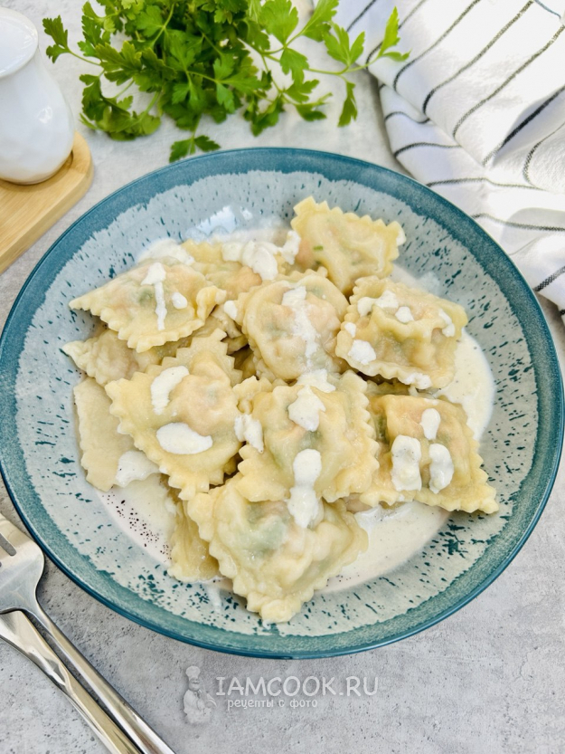 Выложите на тарелку равиоли и полейте горячим сливочным соусом. По желанию украсьте равиоли с семгой в сливочном соусе зеленью, и можно подавать к столу. Приятного аппетита!
