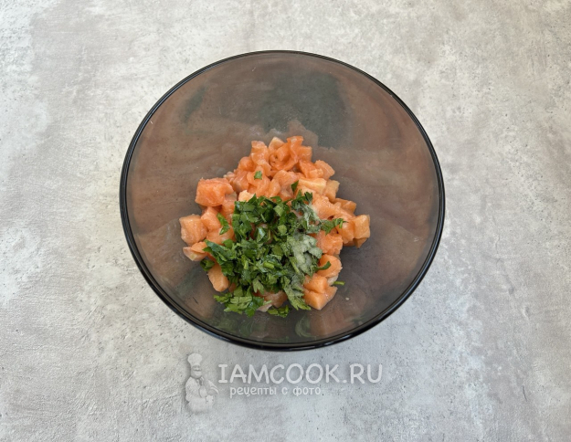 Для начинки семгу нарежьте на мелкие кубики, петрушку мелко порубите, добавьте соль по своему вкусу и хорошо перемешайте.