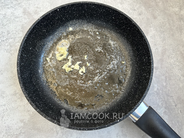 Для приготовления сливочного соуса растопите сливочное масло в сковороде на среднем огне. Добавьте зубчик чеснока, пропущенного через пресс, и обжарьте до золотистого цвета.