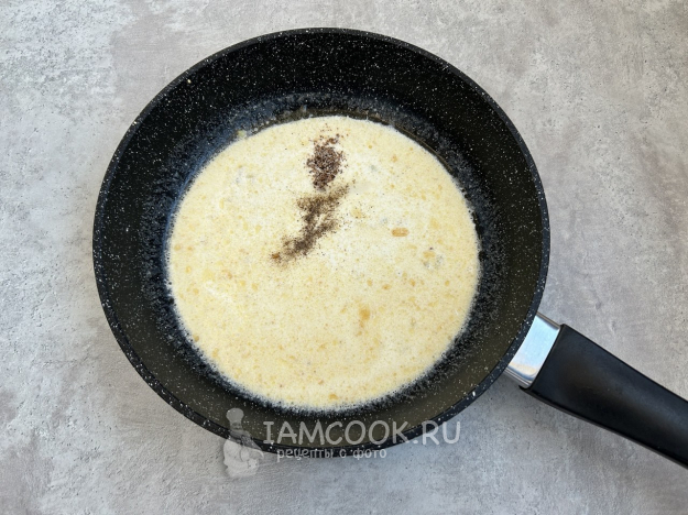 Влейте сливки, добавьте черный молотый перец, мускатный орех, соль и варите соус, пока он не станет однородным и не загустеет.