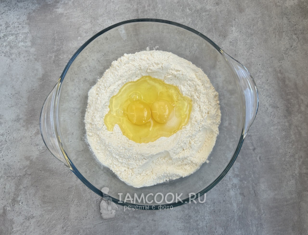 Для начала займемся тестом. Для этого в большой миске смешайте муку и соль. Сделайте углубление посередине, разбейте туда яйца и добавьте подсолнечное масло.