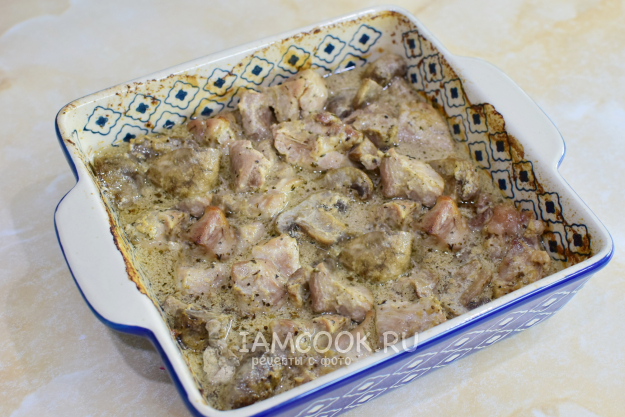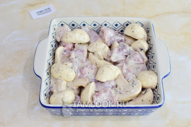 Форму для запекания смажьте растительным маслом и выложите в неё мясо и грибы. Полейте оставшимся маринадом. Прикройте фольгой и поставьте мясо бедра индейки с грибами в духовку, предварительно разогретую до 180 градусов, примерно на 40 минут. Ориентируйтесь по своей духовке. В конце запекания снимите лист фольги.