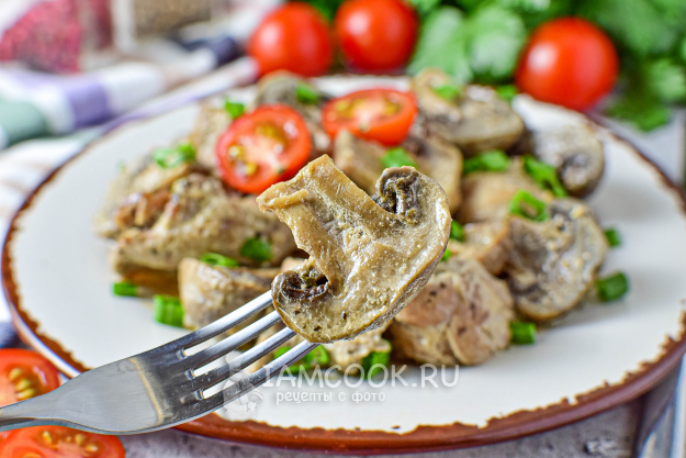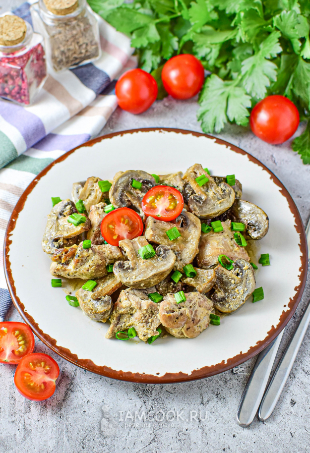 Индейка с грибами готова. После запекания оно оказалось во вкусной и ароматной подливе. Дополнить блюдо можно любым гарниром.