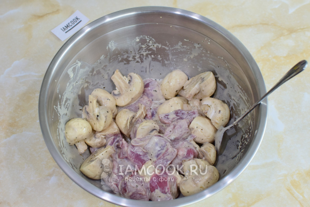 Выложите в чашу мясо и грибы. Перемешайте и оставьте постоять на 30 минут.
