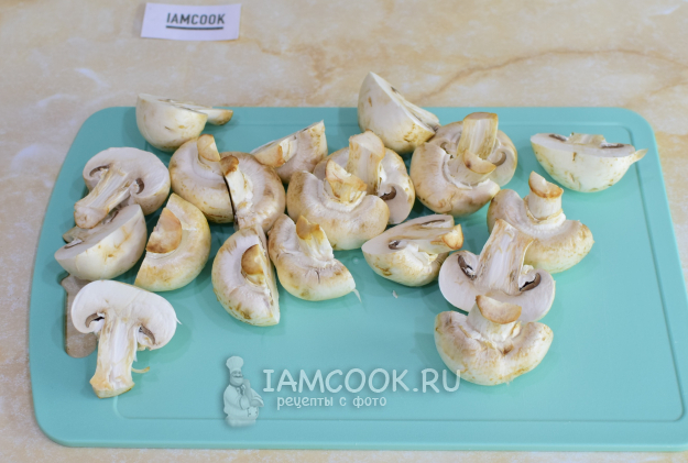 Шампиньоны промойте от загрязнений и разрежьте каждый на 2-4 части. Учитывайте, что при запекании они уменьшатся в размере.