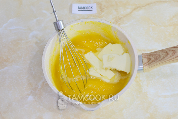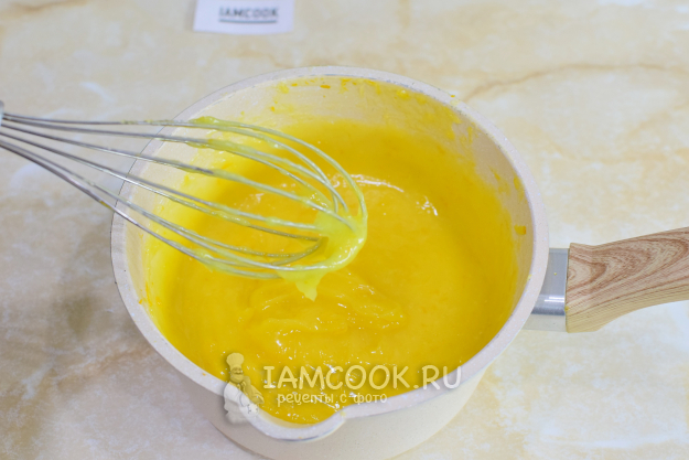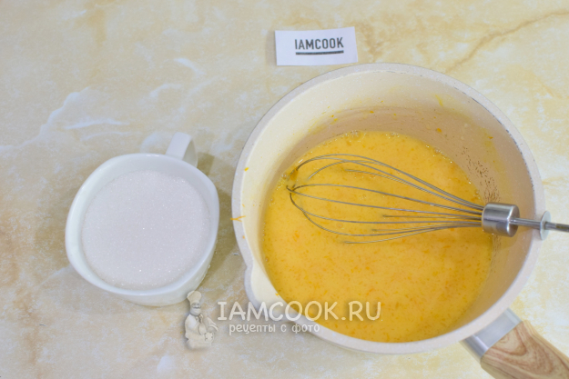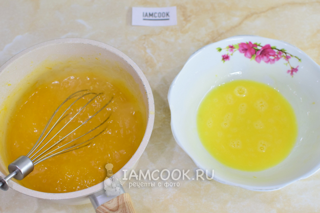Отделите желтки от белков. Белки нам не понадобятся. В отдельной чаше смешайте венчиком желтки. Мешая, введите к желткам мандариновую массу. Затем всё верните обратно на огонь. Доведите снова до кипения.