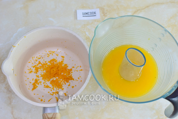 Сок смешайте с цедрой и крахмалом. Добавьте сахар и поставьте на огонь. Помешивая, доведите до кипения. Масса немного загустеет.