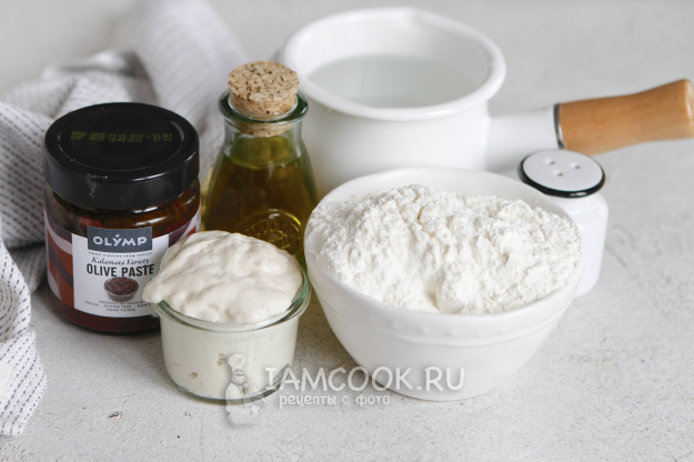 Соберите по списку все продукты для выпечки хлеба с оливками. В этом рецепте я добавляла пасту из оливок с оливковым маслом. Ее можно купить в магазине или приготовить самостоятельно дома.