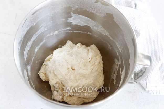 Устанавливаем насадку крюк и на второй скорости работы миксера начинаем замес теста до полного увлажнения муки. Буквально 2 минуты. Оставляем на аутолиз на 30 минут.