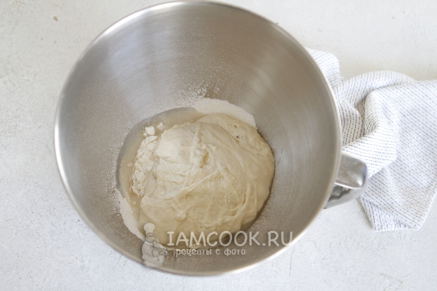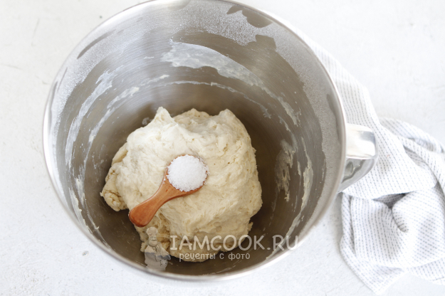 Через 30 минут добавляем соль и на второй скорости работы миксера вымешиваем тесто примерно еще 10 минут.