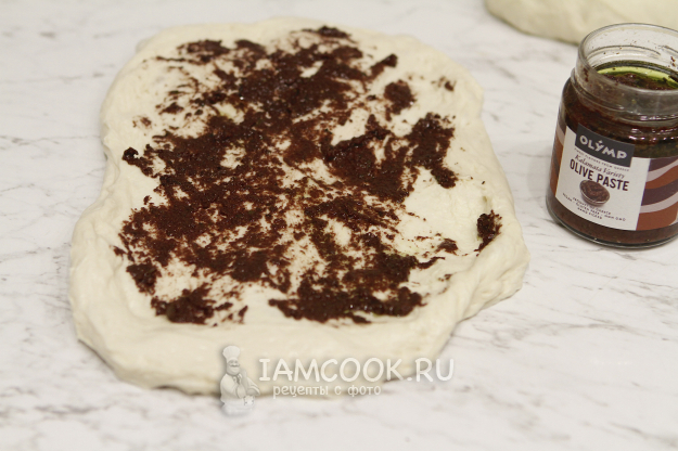Заготовку растянуть, выложить пасту из оливок и разровнять ее. Формовка хлеба - пеленание.