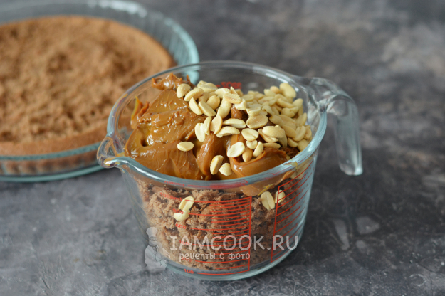 Вынутую мякоть коржа разомните в крошку, добавьте к ней варёную сгущёнку и солёный жареный арахис. Немного арахиса оставьте для декора.