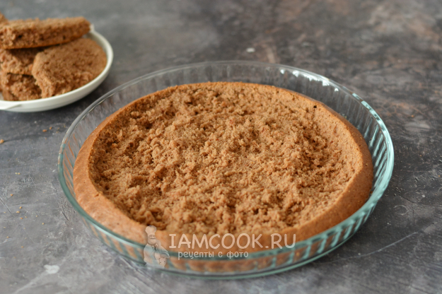 Поместите форму с тестом в холодную духовку. Установите температуру 170°С и выпекайте корж-основу до пробы на сухую спичку. По времени выпечки ориентируйтесь на свою духовку, у меня корж выпекался 25 минут.