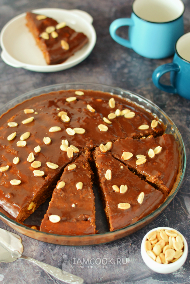 На водяной бане растопите шоколад и залейте верх пирога. Пока шоколад не застыл, украсьте верх отложенным арахисом.