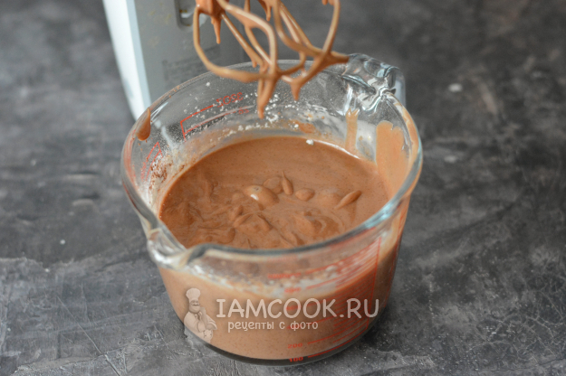 Затем добавьте какао, муку и разрыхлитель и на самой низкой скорости миксера вмешайте в тесто сухие ингредиенты.