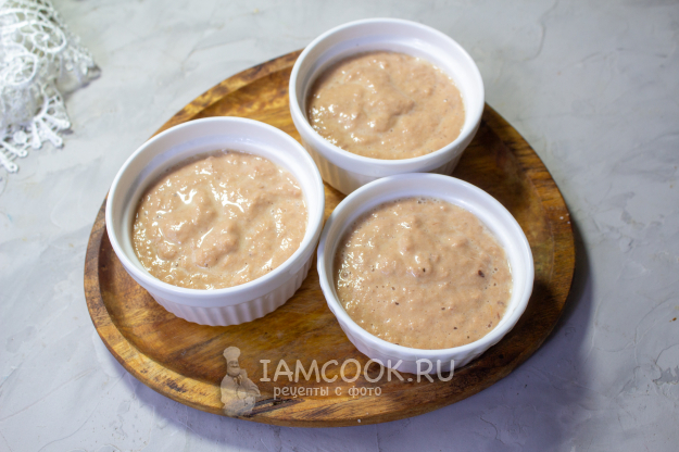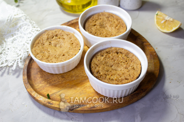 Возьмите небольшие формочки или чашки, можно взять силиконовые формочки для кексов, смажьте их слегка промасленной кисточкой и наполните на 2/3 полученной массой. Поставьте в микроволновку и готовьте при полной мощности (1000 Вт) 4 минуты, а если формочка одна большая, то 5-6 минут.