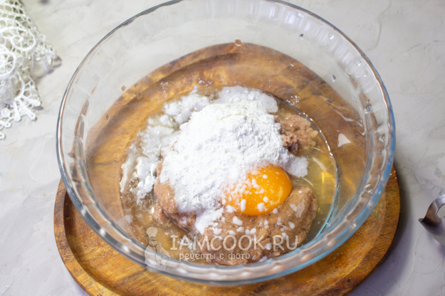 К рыбе добавьте яйцо, разрыхлитель и кукурузный крахмал.