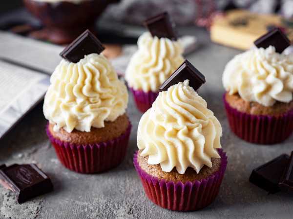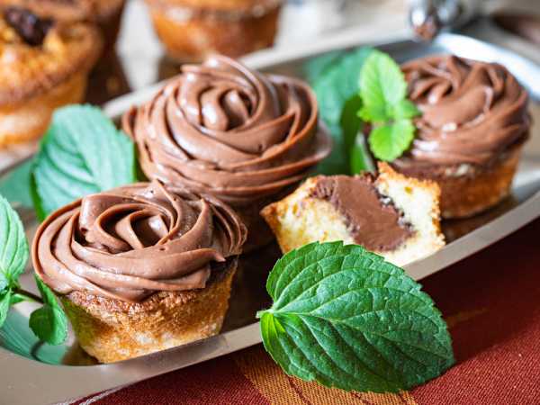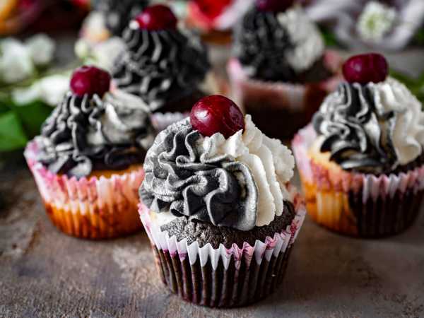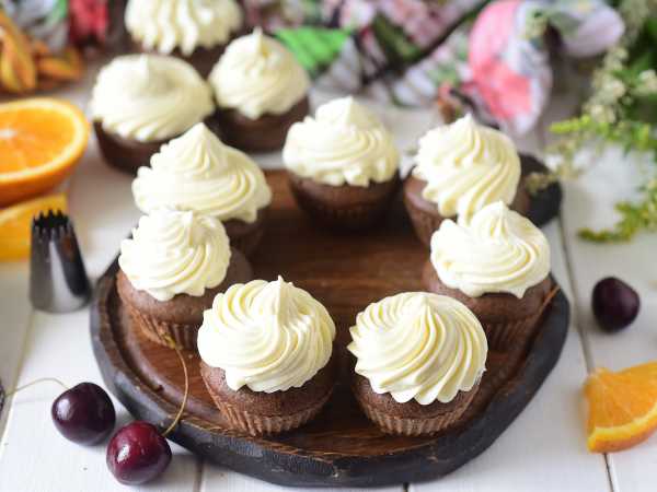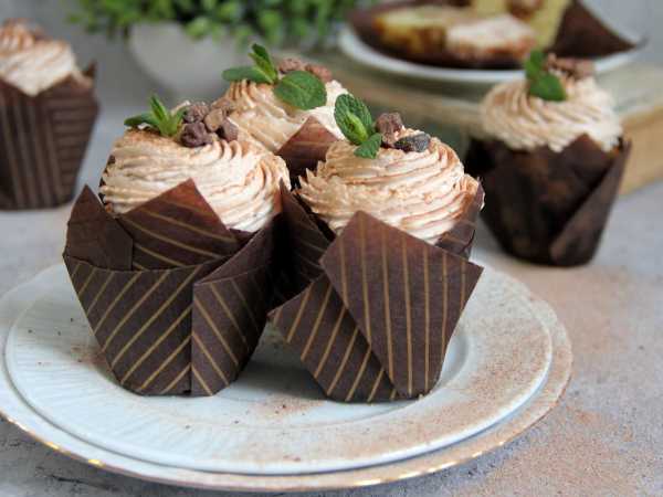 Готовое шоколадное тесто разлейте в бумажные формочки для капкейков и поставьте в духовку, предварительно разогретую до 180 градусов, примерно на 25 минут. Ориентируйтесь по своей духовке.
