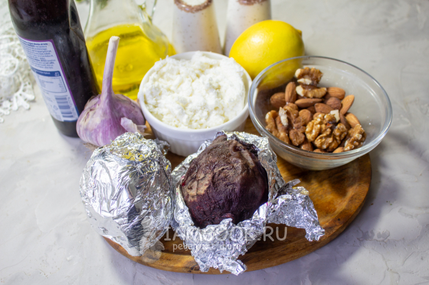 Соберите необходимые продукты для приготовления равиоли из свеклы с творожным сыром. Свеклу я накануне запекла в фольге в духовке в течение 40 минут и остудила. Сыр для начинки взяла "Рикотту".