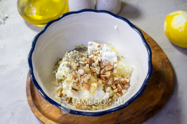 Для начинки выложите рикотту в миску, добавьте лимонную цедру, сушеные итальянские травы, рубленые орехи (у меня миндаль и грецкие), чеснок, пропущенный через пресс. Перемешайте, посолите и поперчите по вкусу.
