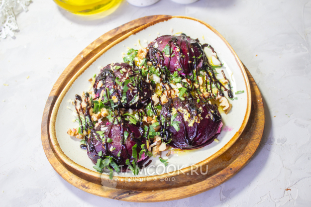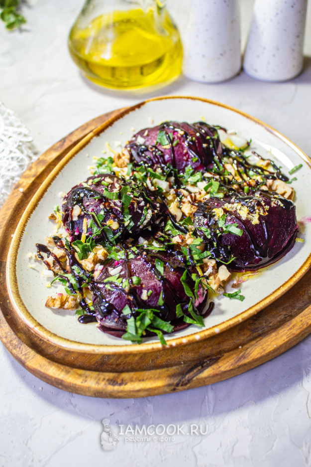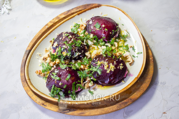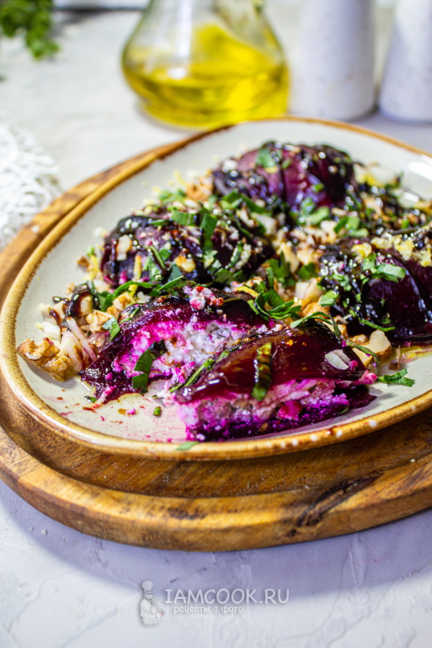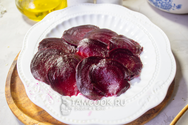 Запеченную свеклу очистите и нарежьте при помощи слайсера или острым ножом на тонкие кружочки. Выберите свеклу небольшого и одинакового размера, так закуска будет смотреться более аккуратно.