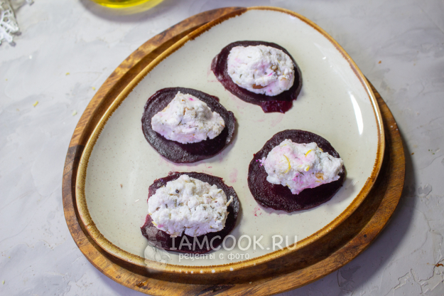 На блюдо для подачи выложите по одному кружочку свеклы. На каждый кружочек выложите сырную начинку.