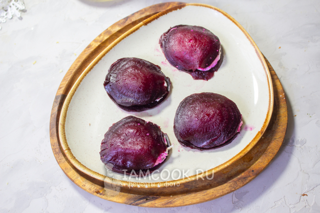Накройте начинку похожим по размеру кружочком свеклы и слегка прижмите.