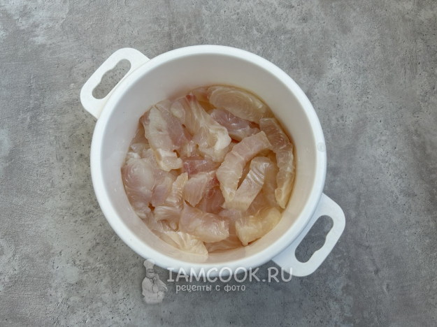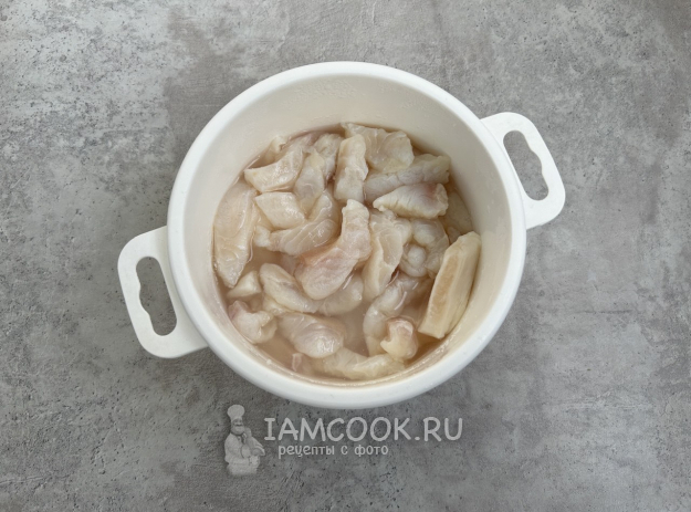 Рыбу хорошо промойте и обсушите бумажным полотенцем. Нарежьте тонкими полосками длиной около 5 сантиметров и шириной примерно 1 сантиметр.