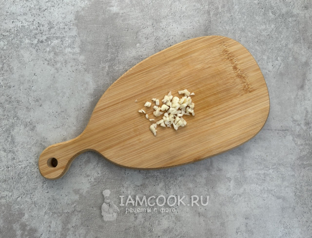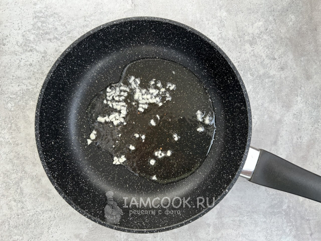В сковороде раскалите масло и выложите чеснок, обжарьте 5-10 секунд.