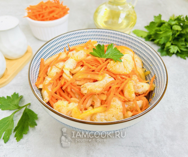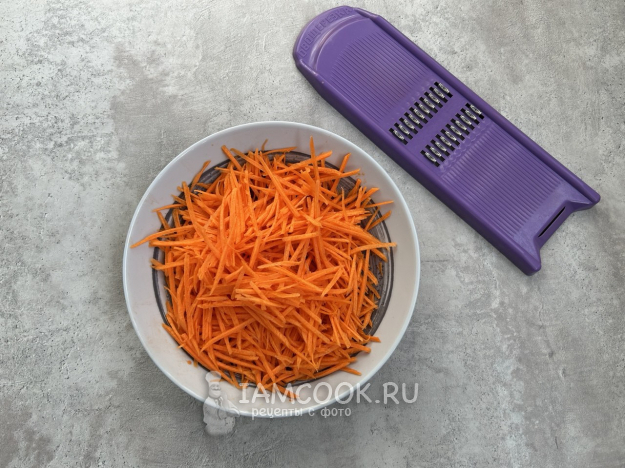 Морковь очистите и натрите на терке для корейской моркови. Если такой терки нет, натрите морковь на крупной терке.