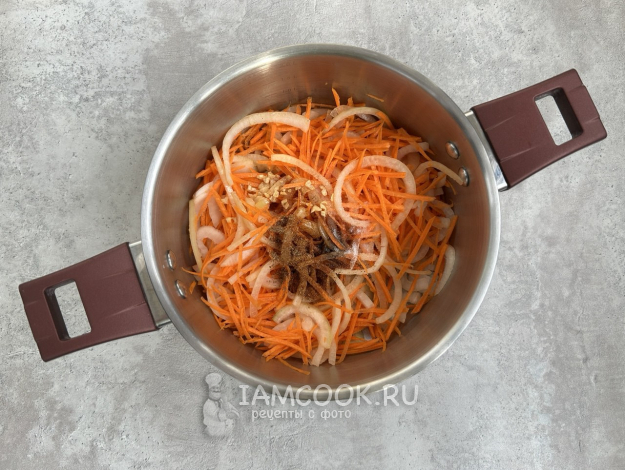 В глубокой емкости смешайте морковь, лук, специи, соль и сахар. Влейте раскаленное растительное масло с чесноком. Всё хорошо перемешайте.