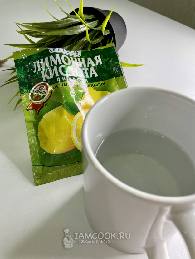 В кружку кладем лимонную кислоту и наливаем 200 мл воды. Перемешиваем и постепенно вливаем в молоко. Слегка перемешиваем молоко и оставляем на 10-15 минут.