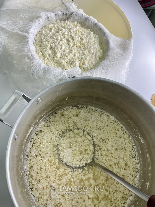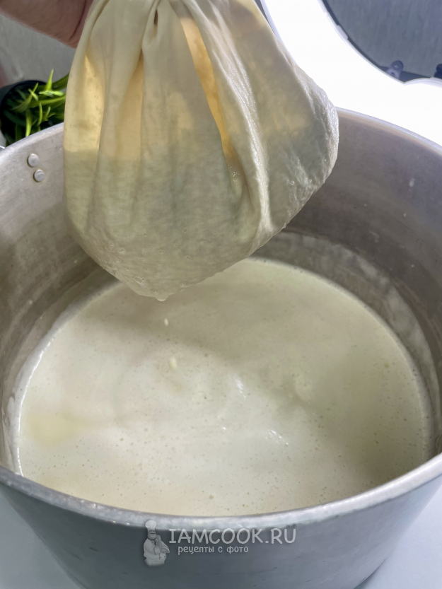 Дуршлаг накрываем марлей и ставим на чашку. Перекладываем будущий сыр на дуршлаг, накрываем тарелкой и сверху ставим литровую банку. Оставляем на ночь. Сыворотка будет стекать в чашку.