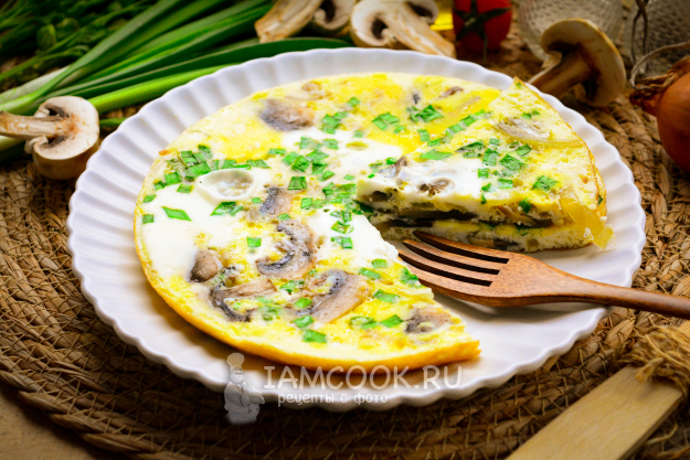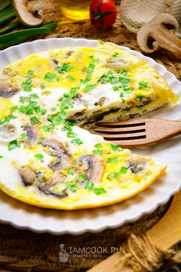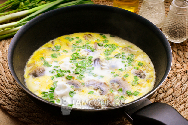 Жарьте омлет с луком и грибами на сковороде на медленном огне под крышкой 5-7 минут. Блюдо готово!