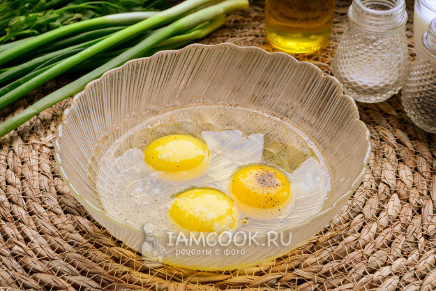 Тем временем вбейте в глубокую миску куриные яйца, посолите и поперчите по вкусу.