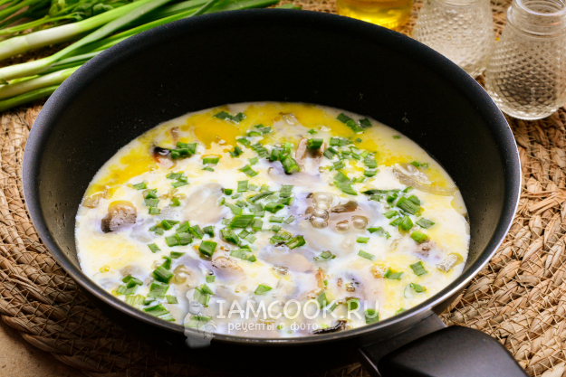 Омлетную смесь влейте в сковороду. Туда же всыпьте нарезанный зеленый лук.