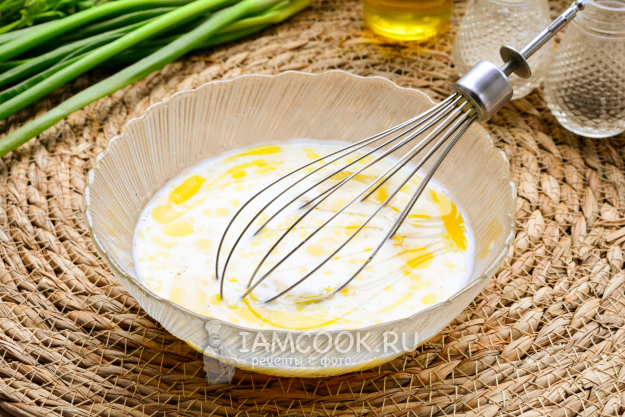 Влейте молоко и взбейте яичную смесь венчиком или вилкой.