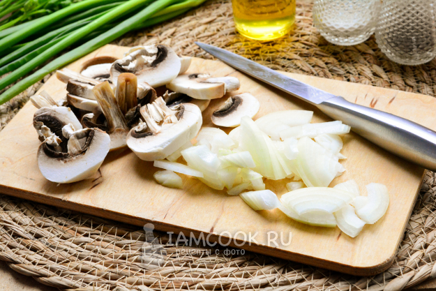 Почистите репчатый лук и шампиньоны. Лук нарежьте четверть-кольцами, а грибы - слайсами.