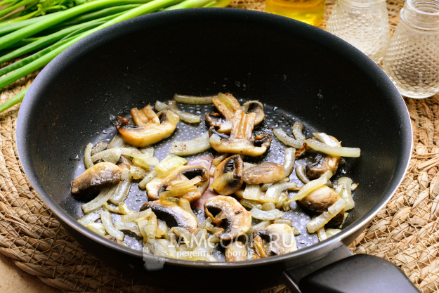 Добавьте нарезанные шампиньоны и жарьте всё вместе еще 3-4 минуты, помешивая. Жареные грибы с луком придадут омлету сочность и яркий аромат.